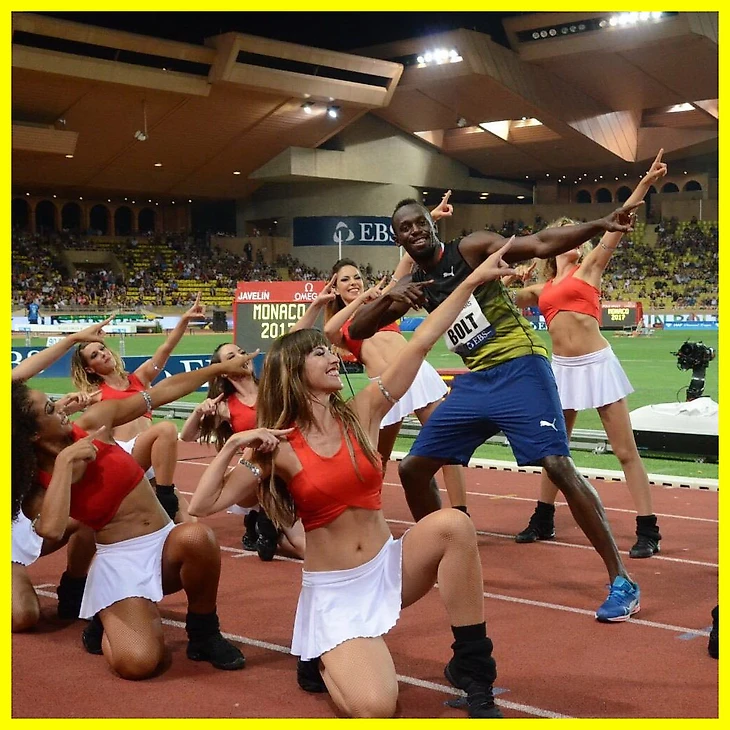 Восьмикратный олимпийский чемпион Усэйн Болт, на своей странице, в одной из соцсетей, выложил фото, сделанное на этапе "Бриллиантовой лиги" в Монако. Спринтер сфотографировался с девушками из группы поддержки, причем все участники снимка были запечатлены в фирменной стойке Болта.