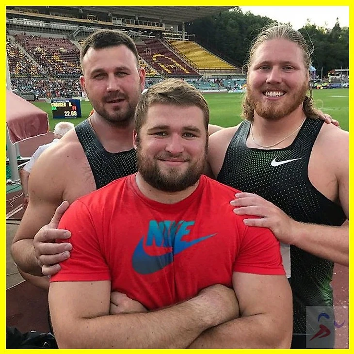 Александр Лесной (Aleksandr Lesnoy, 29) слева, Райан Краузер (Ryan Crouser, 25) справа, Максим Афонин (Maksim Afonin, 26) на переднем плане © 2018 Инстаграм Александра Лесного