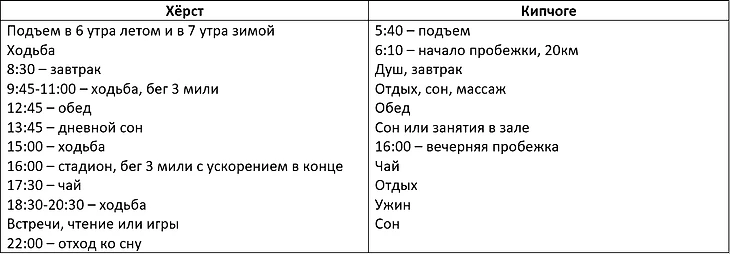 Немецкий бегун по имени Ален Гюттингер недавно опубликовал в Твиттере план типового дня из жизни Элиуда Кипчоге. Помимо этого он включил ту же информацию по Лену Херсту, который, как и Кипчоге, был, пожалуй, лучшим марафонцем своего времени. Кипчоге, конечно, более профессиональный бегун и достигает сегодня рекордных результатов, в то время как Херст, британский спортсмен, выступал в качестве марафонца и ходока на длинные дистанции в конце 19 - начале 20 века. Несмотря на то, что разница между ними составляет более века, их распорядки дня очень похожи, что говорит о том, что, хотя многое изменилось с тех пор, путь к вершине остается почти тем же.
