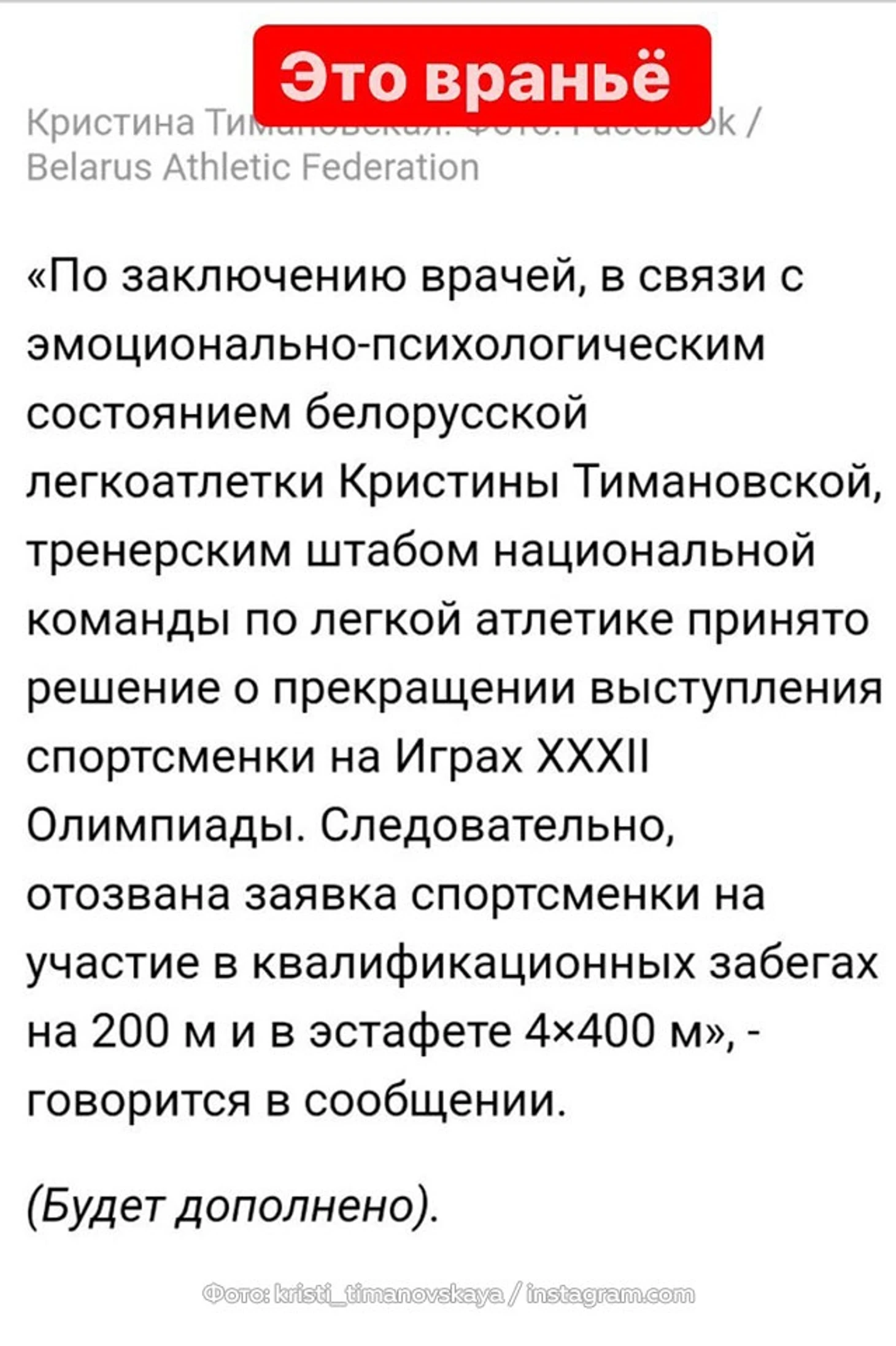 На своей странице в инстаграм Кристина опубликовала видео с очень громкой критикой в адрес чиновников. В взбудоражившей все олимпийское сообщество речи девушка матом проехалась по лицам, ответственным за состав команды на ОИ. В условиях и без того крайне напряженной политической атмосферы вокруг Белоруссии, реакция властей не заставила себя долго ждать. Под предлогом «эмоционально-психологического» состояния спортсменки ее депортируют обратно на Родину, не давая возможности пробежать на заявленных стартах. После чего все в том же инстаграме Тимановская опровергает данную информацию, призывая не верить Белорусским источникам.
