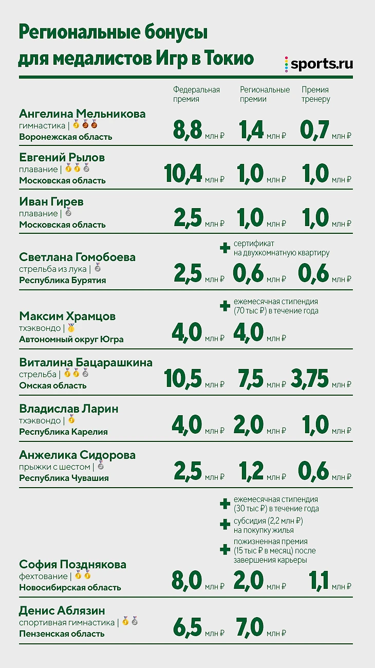 Региональные премии платит субъект федерации, от которого спортсмен выступает. После Олимпиады каждый регион отдельно объявляет о бонусах: пока цифры назвали не все, но мы собрали все открытые данные. Зафиксируем главные моменты: