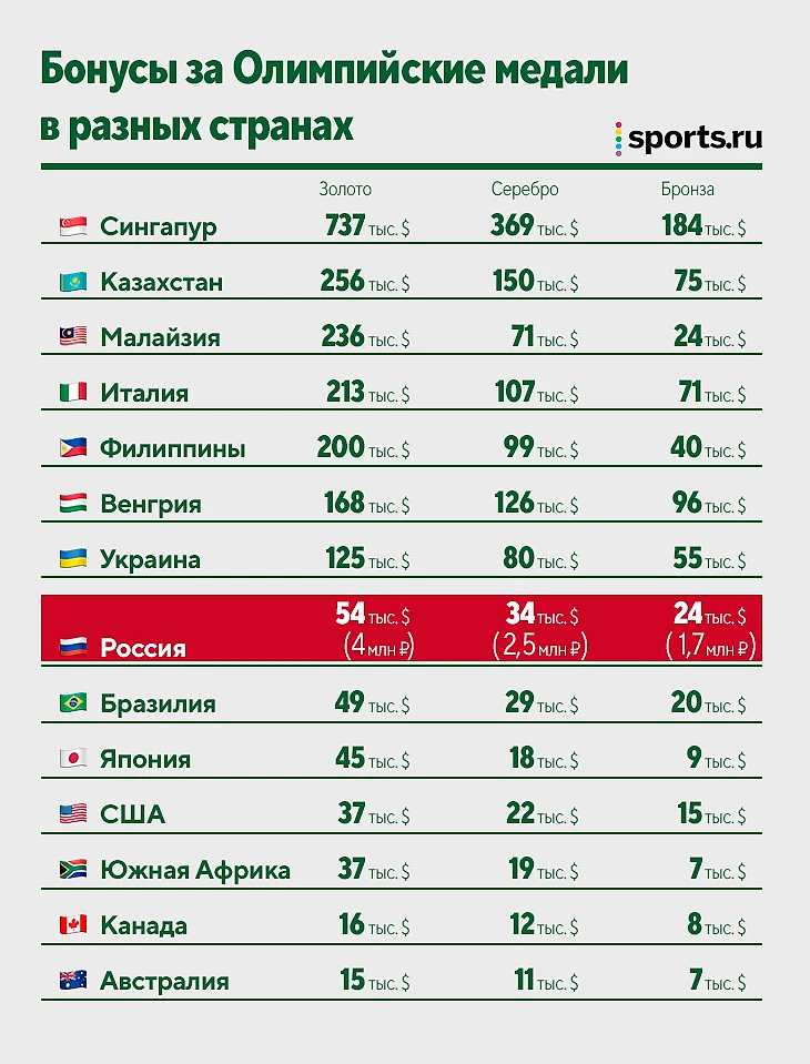 • Сингапур (лидер по гонорарам) платит за золотую медаль почти миллион долларов. «В таких странах как Сингапур многие национальные спортивные инициативы финансируются правительствами, которые готовы платить большие вознаграждения для роста спортивной культуры», – объяснял Унмиша Партасарати (босс консалтинговой фирмы Picture Board Partners) в интервью CNBC.
