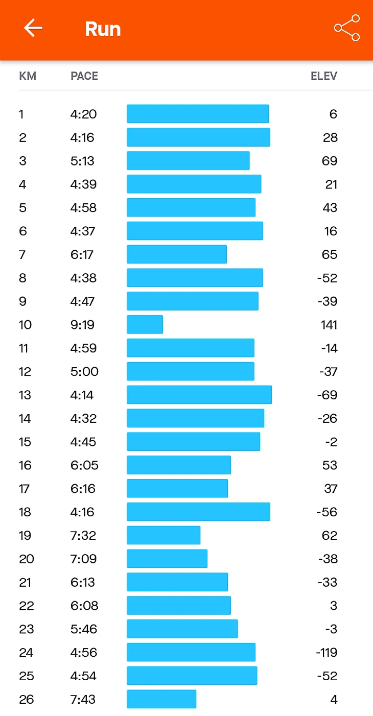 Преодолено 26 километров с минимальной высотой - 70 метров, максимальной - 401 метр. Общий набор высоты - 820 метров (согласно информации на беговых часах). Контрольное время прохождения дистанции: 5 часов.
