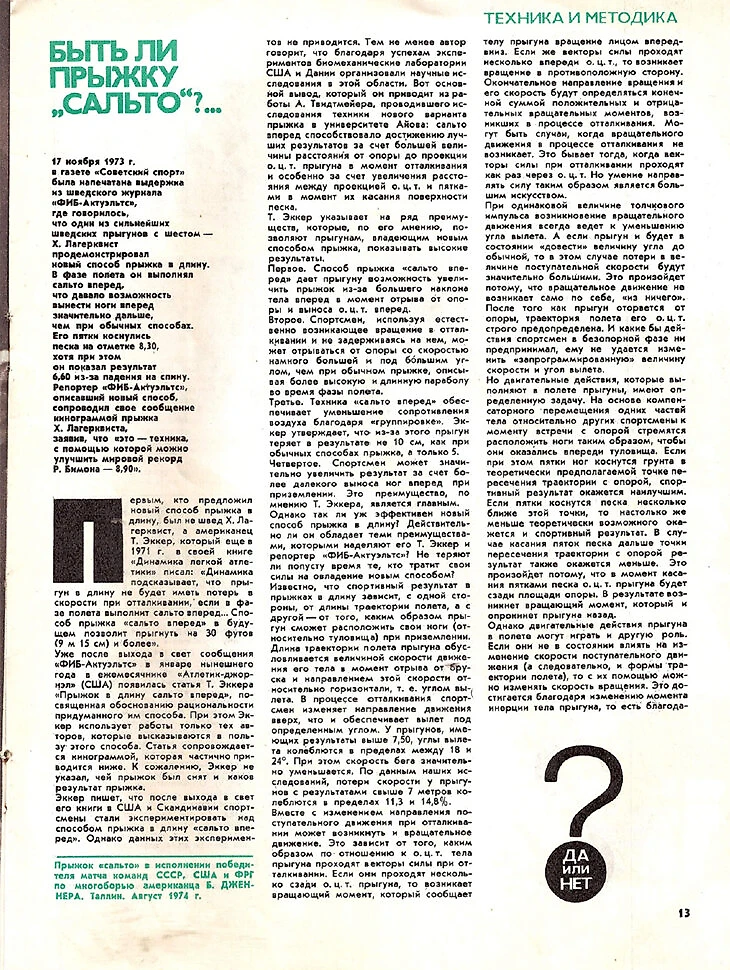 В ноябре 1974 года в журнале «Легкая атлетика» опубликован подробный материал «Быть ли прыжку «сальто»?