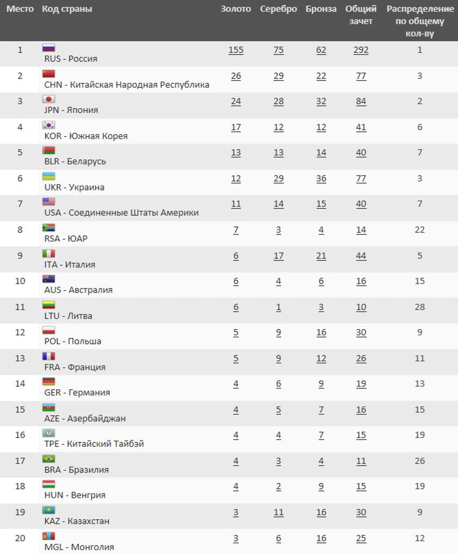 Предыдущее достижение принадлежало Китаю, который в 2011 году на домашней Универсиаде в Шеньчжене выиграл 145 медалей (75 золотых – 39 серебряных – 31 бронзовую).