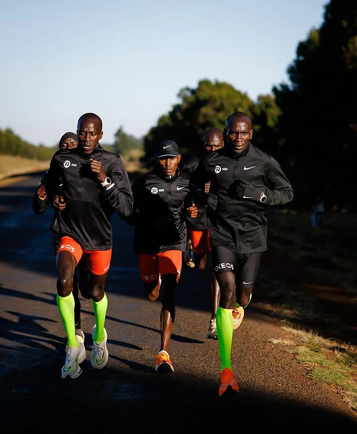 Рацион Кипчоге включает в себя основные кенийские (акцент на местные и натуральные) продукты, такие как угали (каша из кукурузной муки), картофель, рис, чапати (пшеничные лепешки), манагу (богатая железом листовая зелень), бобы, цельное молоко, яйца, курица и говядина. Мясо подают примерно половину дней в неделю, чтобы достичь цели по количеству потребляемого белка. Кипчоге пьет малу - местную простоквашу, в которой каждые 170 мл содержат около 7 г белка, что делает этот напиток сравнимым с кефиром, который можно найти в большинстве молочных отделов. Беттонвиль также представил в меню Кипчоге кашу с высоким содержанием белка (Кипчоге ест ее с фруктами после тренировки), приготовленную из сывороточного белка и теффа - зерна, которое содержит 10 г белка на приготовленные 180 г.