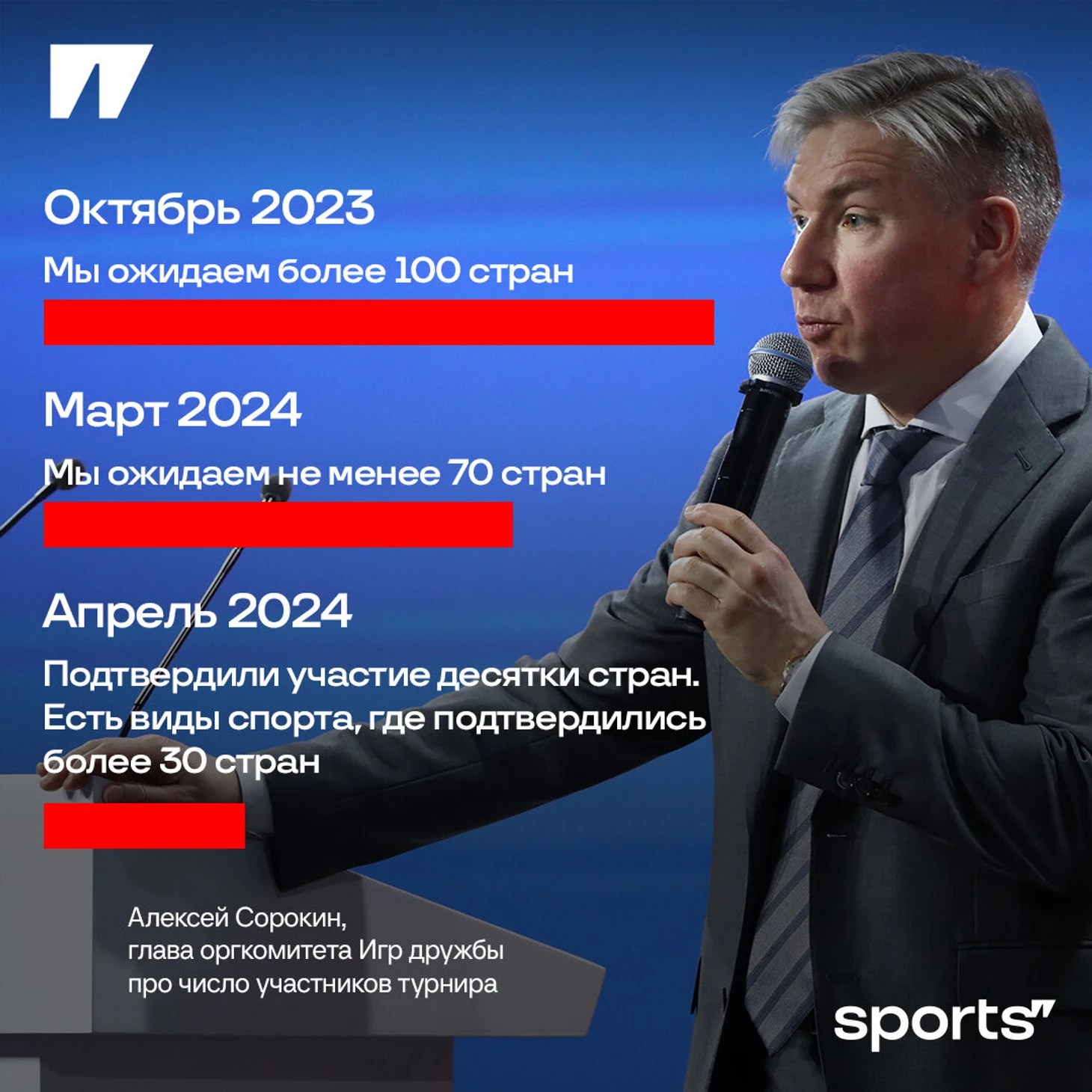 ● Глава ОКР Станислав Поздняков осенью 2023-го говорил, что Игры дружбы устранят несправедливость, созданную МОК: «Мы устраняем несправедливость, которая была в отношении наших спортсменов допущена МОК. Игры дружбы, которые состоятся с большим успехом в следующем году, послужат двум целям – мирной миссии спорта и свободному участию в соревнованиях всех спортсменов.