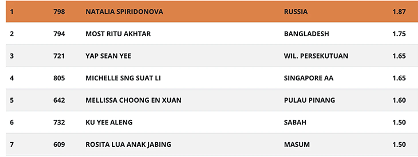 ● чемпионат Малайзии в этом году проводился в открытом формате. Помимо Спиридоновой приехали спортсмены из Индонезии, Бангладеш и некоторых других азиатских стран;
