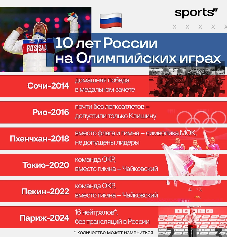 Путь нашего спорта за 10 лет: от праздника в Сочи до 16 олимпийцев в Париже (без флага, гимна и трансляций)