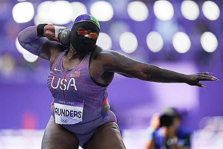 Это Григорий Родченков? Это Дэдпул? Нет, это американка Рэйвен Сондерс в квалификации толкания ядра на Олимпиаде.