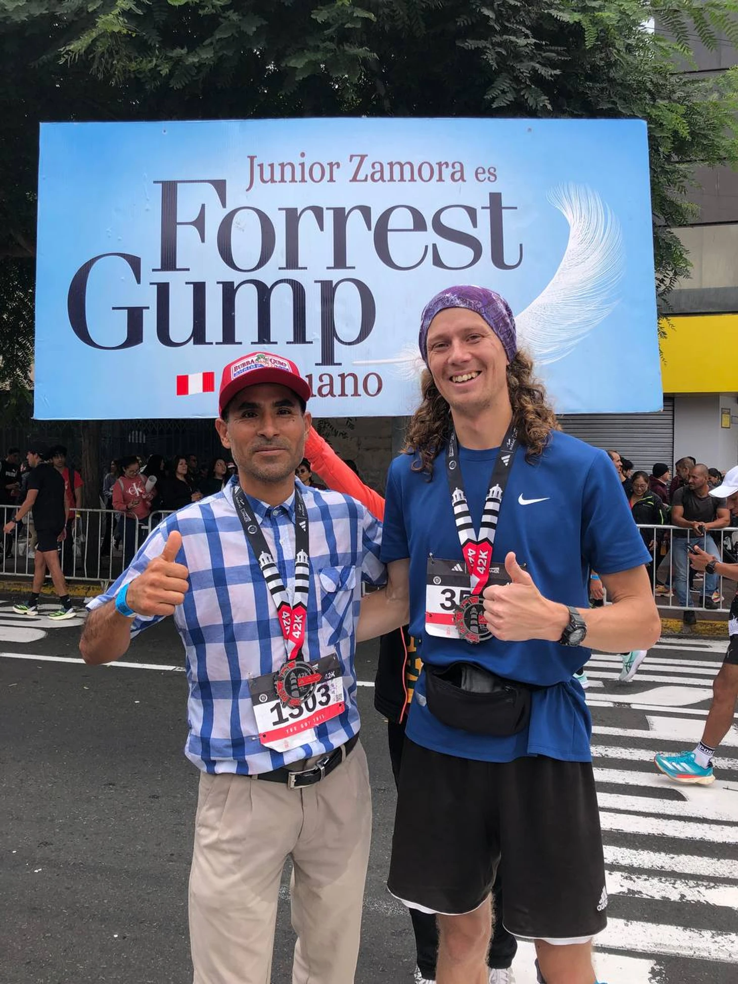 После финиша, получив медаль и восстанавливаясь, я заметил мужчину в кепке, рубашке с коротким рукавом и штанах. Сначала я не понял, что он делает среди бегунов. Присмотревшись, я увидел плакат «Джуниор Самора – перуанский Форрест Гамп». Оказалось, Джуниор оделся как герой фильма и так пробежал марафон. По его словам, на это ему потребовалось 3 часа и 3 минуты.
