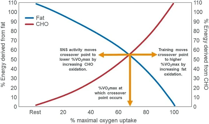 Одним из наиболее интересных результатов этого исследования стало изменение так называемой «точки пересечения» — интенсивности упражнений, при которой энергетические потребности организма обеспечиваются большей долей глюкозы, чем жиров/липидов. Традиционно, точка пересечения достигается при интенсивности упражнений от 60% до 70% от максимального уровня потребления кислорода, при этом максимальное окисление жиров происходит где-то в этом диапазоне. У участников, адаптированных к низкоуглеводной диете, точка пересечения наступала гораздо позже, а максимальное окисление жиров достигалось при интенсивности упражнений выше 85% от максимальной.