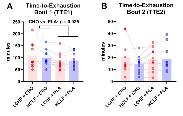 Показатели выносливости во время последующих тестов на выносливость (TTE2) оставались стабильными при обоих вариантах диеты: время до наступления истощения не различалось между низкоуглеводной и высокоуглеводной диетами, независимо от того, употребляли ли участники углеводы.