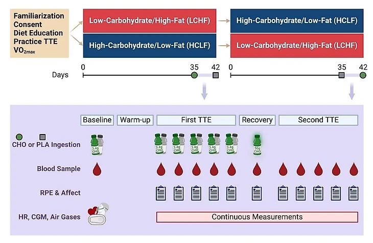 В исследовании участвовала группа здоровых, тренированных атлетов, занимающихся видами спорта на выносливость, с большим опытом длительных тренировок (триатлон). Случайным образом им была назначена либо низкоуглеводная (НУ), либо высокоуглеводная (ВУ) диета, сроком на 6 недель каждая, после двухнедельного транзитного периода они переходили на другую диету. Обе диеты были изокалорийными (одинаковое количество калорий), что обеспечивало равное потребление калорий во всех группах, несмотря на различия в составе макронутриентов. Примечательно, что низкоуглеводная диета включала менее 50 г углеводов в день, 70–80% жиров и 20–25% белков, в то время как высокоуглеводная диета включала ~380 г углеводов в день (60–65% от общего количества калорий), <30% жиров и 20–25% белков.