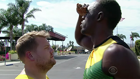 9-кратный олимпийский чемпион и Джеймс Корден на обычной парковке.