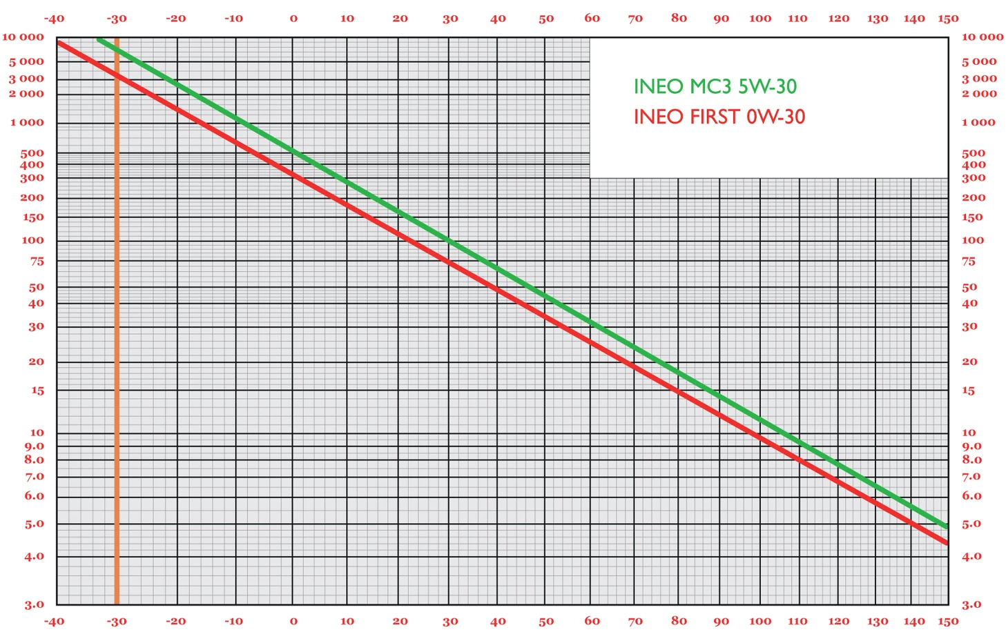 Этот график показывает зависимость кинематической вязкости масла от температуры. Если провести вертикальную черту на отметке –30°C, линия 0W-30 пересечет ее в точке 3000 сСт, а линия 5W-30 — на уровне примерно 8000 сСт. Это значит, что моторные масла обоих классов при такой температуре останутся текучими, но масло класса 0W-30 заметно упростит холодный запуск двигателя и будет намного легче прокачиваться через смазочную систему в сильный мороз. При дальнейшем понижении температуры разница в вязкости 5W-30 и 0W-30 будет только возрастать.