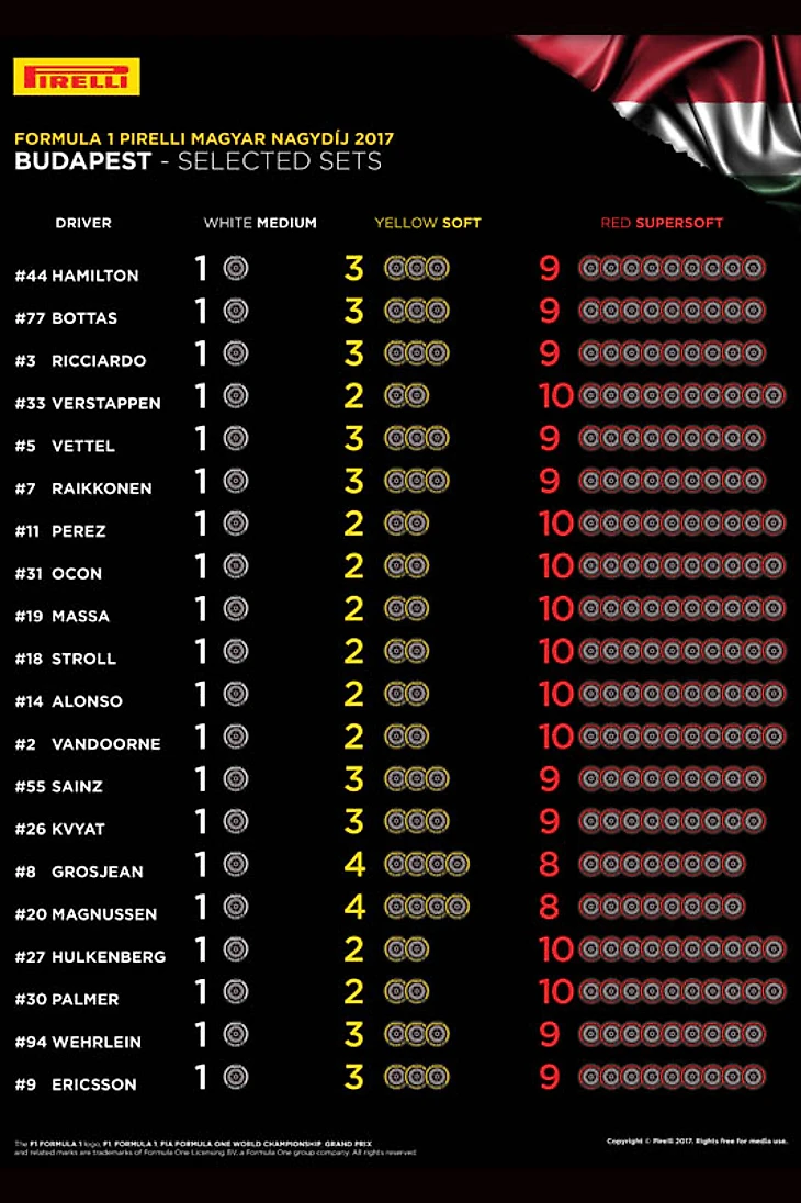 Шинный поставщик в «Формуле-1» компания «Пирелли» объявила выбор покрышек командами на Гран-при Венгрии. Из трех типов шин – «медиум», «софт» и «суперсофт» – конюшни предпочли наиболее мягкие составы.