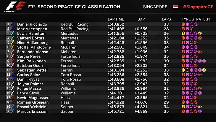 Гран-при СингапураМарина-Бэй, Сингапур15 сентября 2017 года2-я практика1. Даниэль Риккардо («Ред Булл») – 1.40,852 (33 круга)2. Макс Ферстаппен («Ред Булл») +0,556 (28)3. Льюис Хэмилтон («Мерседес») +0,703 (36)4. Валттери Боттас («Мерседес») +1,252 (35)5. Нико Хюлькенберг («Рено») +1,596 (33)6. Стоффель Вандорн («Макларен») +1,649 (34)7. Фернандо Алонсо («Макларен») +1,936 (32)8. Серхио Перес («Форс-Индия») +1,974 (35)9. Кими Райкконен («Феррари») +1,983 (30)10. Эстебан Окон («Форс-Индия») +2,202 (34)11. Себастьян Феттель («Феррари») +2,252 (33)12. Карлос Сайнс-младший («Торо Россо») +2,384 (38)13. Даниил Квят («Торо Россо») +2,756 (32)14. Джолион Палмер («Рено») +2,943 (32)15. Фелипе Масса («Уильямс») +2,984 (32)16. Ланс Стролл («Уильямс») +3,449 (32)17. Кевин Магнуссен («Хаас») +3,565 (32)18. Ромен Грожан («Хаас») +4,076 (29)19. Паскаль Верляйн («Заубер») +4,821 (34)20. Маркус Эрикссон («Заубер») +4,869 (35)
