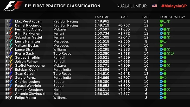 Гран-при МалайзииСепанг29 сентября 2017 года1-я практика 1. Макс Ферстаппен («Ред Булл») – 1.48,962 (11 кругов)2. Даниэль Риккардо («Ред Булл») +0,757 (12)3. Фернандо Алонсо («Макларен») +1,635 (6)4. Кими Райкконен («Феррари») +1,772 (12)5. Себастьян Феттель («Феррари») +2,047 (12)6. Льюис Хэмилтон («Мерседес») +2,556 (8)7. Валттери Боттас («Мерседес») +3,045 (10)8. Ланс Стролл («Уильямс») +3,333 (8)9. Пьер Гасли («Торо Россо») +3,418 (14)10. Сергей Сироткин («Рено») +4,559 (10)11. Джолион Палмер («Рено») +4,663 (10)12. Стоффель Вандорн («Макларен») +4,809 (10)13. Эстебан Окон («Форс-Индия») 4,934 (6)14. Шон Гелаэль («Торо Россо») +5,648 (13)15. Серхио Перес («Форс-Индия») +5,707 (4)16. Шарль Леклер («Заубер») +6,318 (10)17. Паскаль Верляйн («Заубер») +6,690 (10)18. Ромен Грожан («Хаас») +7,249 (8)19. Антонио Джовинацци («Хаас») +7,377 (6)20. Фелипе Масса («Уильямс») – (3)