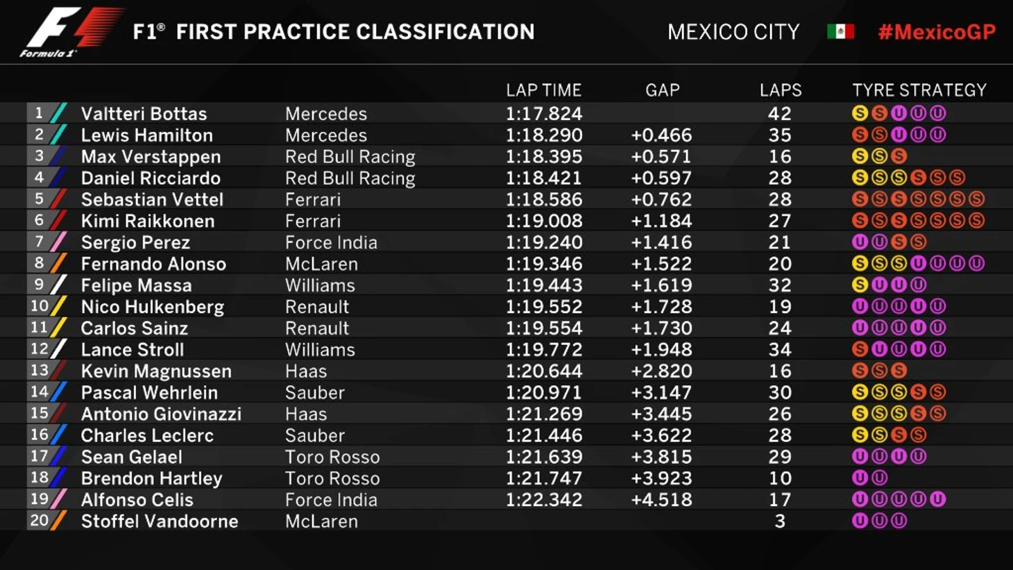 Гран-при МексикиАвтодром имени братьев Родригес, Мехико27 октября 2017 года1-я практика 1. Валттери Боттас («Мерседес») – 1.17,824 (42 круга)2. Льюис Хэмилтон («Мерседес») +0,466 (35)3. Макс Ферстаппен («Ред Булл») +0,571 (16)4. Даниэль Риккардо («Ред Булл») +0,597 (28)5. Себастьян Феттель («Феррари») +0,762 (28)6. Кими Райкконен («Феррари») +1,184 (27)7. Серхио Перес («Форс-Индия») +1,416 (21)8. Фернандо Алонсо («Макларен») +1,522 (20)9. Фелипе Масса («Уильямс») +1,619 (32)10. Нико Хюлькенберг («Рено») +1,728 (19)11. Карлос Сайнс-младший («Рено») +1,730 (24)12. Ланс Стролл («Уильямс») +1,948 (34)13. Кевин Магнуссен («Хаас») +2,820 (16)14. Паскаль Верляйн («Заубер») +3,147 (30)15. Антонио Джовинацци («Хаас») +3,445 (26)16. Шарль Леклер («Заубер») +3,622 (28)17. Шон Гелаэль («Торо Россо») +3,815 (29)18. Брендон Хартли («Торо Россо») +3,923 (10)19. Альфонсо Селис («Форс-Индия») +4,518 (17)20. Стоффель Вандорн («Макларен») – (3)