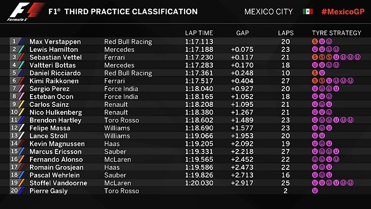 Гран-при МексикиАвтодром имени братьев Родригес, Мехико28 октября 2017 года3-я практика 1. Макс Ферстаппен («Ред Булл») – 1.17,113 (20 кругов)2. Льюис Хэмилтон («Мерседес») +0,075 (23)3. Себастьян Феттель («Феррари») +0,117 (21)4. Валттери Боттас («Мерседес») +0,170 (18)5. Даниэль Риккардо («Ред Булл») +0,248 (10)6. Кими Райкконен («Феррари») +0,404 (27)7. Серхио Перес («Форс-Индия») +0,927 (20)8. Эстебан Окон («Форс-Индия») +1,052 (18)9. Карлос Сайнс-младший («Рено») +1,095 (21)10. Нико Хюлькенберг («Рено») +1,267 (21)11. Брендон Хартли («Торо Россо») +1,489 (23)12. Фелипе Масса («Уильямс») +1,577 (23)13. Ланс Стролл («Уильямс») +1,953 (20)14. Кевин Магнуссен («Хаас») +2,092 (19)15. Маркус Эрикссон («Заубер») +2,218 (27)16. Фернандо Алонсо («Макларен») +2,452 (22)17. Ромен Грожан («Хаас») +2,473 (22)18. Паскаль Верляйн («Заубер») +2,713 (16)19. Стоффель Вандорн («Макларен») +2,917 (25)20. Пьер Гасли («Торо Россо») - (2)