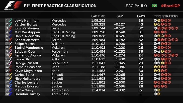 Гран-при БразилииАвтодром имени Жозе Карлуса Пасе, Интерлагос10 ноября 2017 года1-я практика 1. Льюис Хэмилтон («Мерседес») – 1.09,202 (36 кругов)2. Валттери Боттас («Мерседес») +0,127 (43)3. Кими Райкконен («Феррари») +0,542 (32)4. Макс Ферстаппен («Ред Булл») +0,548 (31)5. Даниэль Риккардо («Ред Булл») +0,626 (38)6. Себастьян Феттель («Феррари») +0,782 (32)7. Фелипе Масса («Уильямс») +0,900 (28)8. Стоффель Вандорн («Макларен») +1,200 (26)9. Эстебан Окон («Форс-Индия») +1,252 (36)10. Фернандо Алонсо («Макларен») +1,274 (24)11. Ланс Стролл («Уильямс») +1,430 (42)12. Джордж Расселл («Форс-Индия») +1,845 (29)13. Ромен Грожан («Хаас») +1,986 (29)14. Кевин Магнуссен («Хаас») +2,261 (30)