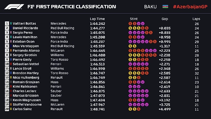 Гран-при Азербайджана. 1-я практика. Боттас – первый, Риккардо – второй, Перес – третий, Сироткин – 8-й