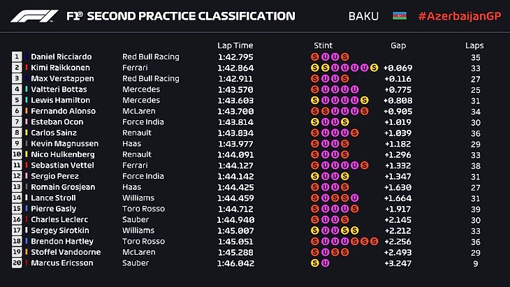 Гран-при АзербайджанаБаку27 апреля 2018 года2-я практика 1. Даниэль Риккардо («Ред Булл») – 1.42,795 (35 кругов)2. Кими Райкконен («Феррари») +0,069 (33)3. Макс Ферстаппен («Ред Булл») +0,116 (27)4. Валттери Боттас («Мерседес») +0,775 (25)5. Льюис Хэмилтон («Мерседес») +0,808 (31)6. Фернандо Алонсо («Макларен») +0,905 (34)7. Эстебан Окон («Форс-Индия») +1,019 (30)8. Карлос Сайнс-младший («Рено») +1,039 (36)9. Кевин Магнуссен («Хаас») +1,182 (29)10. Нико Хюлькенберг («Рено») +1,296 (33)11. Себастьян Феттель («Феррари») +1,332 (38)12. Серхио Перес («Форс-Индия») +1,347 (31)13. Ромен Грожан («Хаас») +1,630 (27)14. Ланс Стролл («Уильямс») +1,664 (31)15. Пьер Гасли («Торо Россо») +1,917 (39)16. Шарль Леклер («Заубер») +2,145 (30)17. Сергей Сироткин («Уильямс») +2,212 (33)18. Брендон Хартли («Торо Россо») +2,256 (36)19. Стоффель Вандорн («Макларен») +2,493 (29)20. Маркус Эрикссон («Заубер») +3,247 (9)