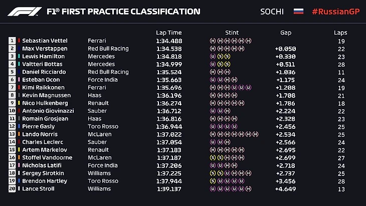 Гран-при РоссииСочи Автодром, Сочи28 сентября 2018 года1-я практика1. Себастьян Феттель («Феррари») – 1.34,488 (19 кругов)2. Макс Ферстаппен («Ред Булл») +0,050 (22)3. Льюис Хэмилтон («Мерседес») +0,330 (23)4. Валттери Боттас («Мерседес») +0,511 (28)5. Даниэль Риккардо («Ред Булл») +1,036 (11)6. Эстебан Окон («Форс-Индия») +1,175 (24)7. Кими Райкконен («Феррари») +1,208 (19)8. Кевин Магнуссен («Хаас») +1,708 (21)9. Нико Хюлькенберг («Рено») +1,786 (18)10. Антонио Джовинацци («Заубер») +2,224 (22)11. Ромен Грожан («Хаас») +2,328 (23)12. Пьер Гасли («Торо Россо») +2,456 (25)13. Ландо Норрис («Макларен») +2,534 (25)14. Шарль Леклер («Заубер») +2,566 (24)15. Артем Маркелов («Рено») +2,695 (22)16. Стоффель Вандорн («Макларен») +2,699 (27)17. Николя Латифи («Форс-Индия») +2,718 (24)18. Сергей Сироткин («Уильямс») +2,737 (25)19. Брендон Хартли («Торо Россо») +3,456 (28)20. Ланс Стролл («Уильямс») +4,649 (13)