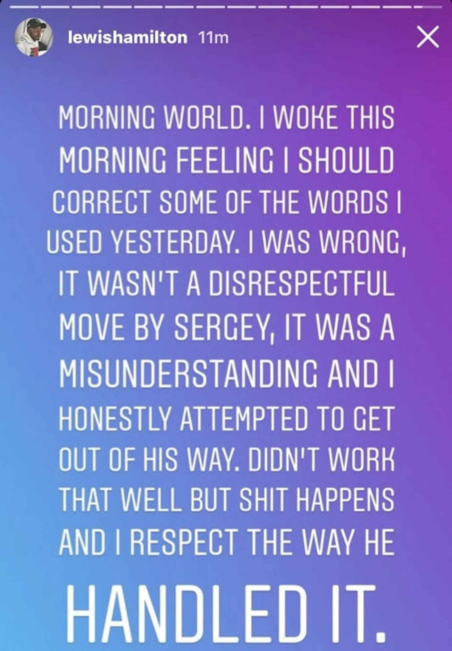 «Доброе утро, мир. Я проснулся с чувством, что должен исправиться за сказанное вчера. Я ошибался – маневр Сергея не был неуважительным. Произошло недопонимание, я честно попытался уйти с его траектории. Вышло не очень здорово, но дерьмо случается, и я уважаю его за то, как он с этим справился», – написал Хэмилтон в инстаграме.