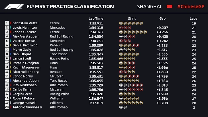 Гран-при Китая. 1-я практика. Феттель – первый, Хэмилтон – второй, Леклер – третий, Квят – 8-й