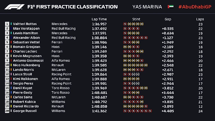 Гран-при Абу-Даби-2019. 1-я практика. Боттас – первый, Ферстаппен – второй, Хэмилтон – третий, Квят – 15-й