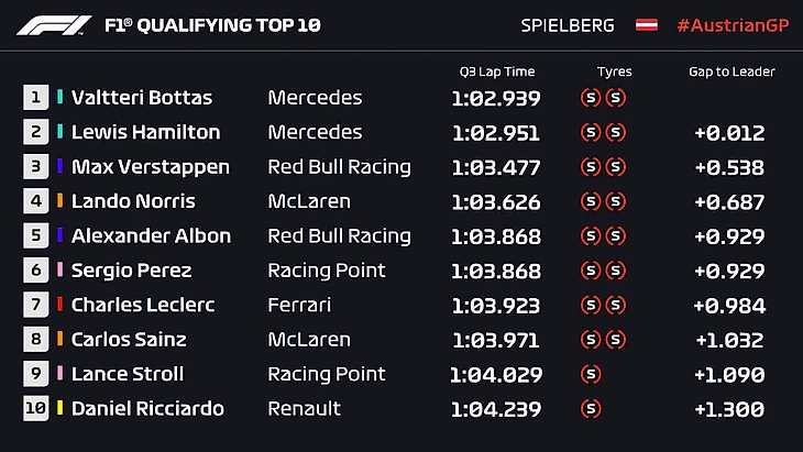 Гран-при Австрии-2020. Квалификация. Боттас выиграл поул, Хэмилтон – второй, Ферстаппен – третий, Квят – 13-й