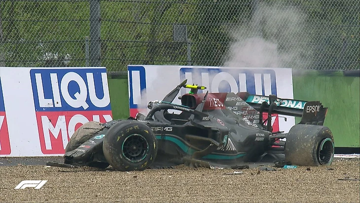 Авария случилась при попытке Расселла выйти вперед финского пилота в первом скоростном повороте на трассе в Имоле – гонщик «Мерседеса» начал движение в сторону «Уильямса», и тот был вынужден сместиться правее, но зацепил на огромной скорости траву, после чего сине-белую машину бросило в «Мерседес».