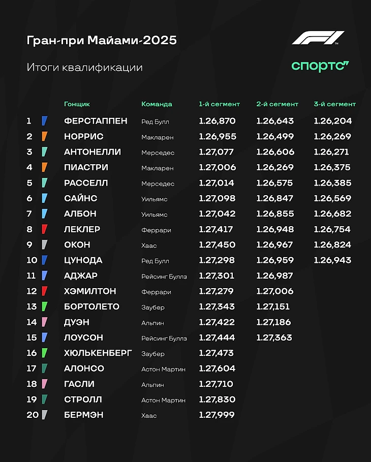 Гран-при Майами-2025. Ферстаппен выиграл квалификацию, Норрис – 2-й, Антонелли – 3-й, Пиастри – 4-й
