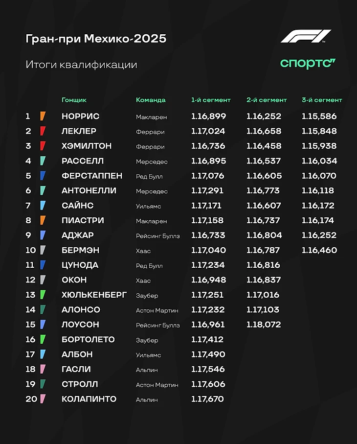 Гран-при Мехико-2025. Норрис выиграл квалификацию, Леклер – 2-й, Хэмилтон – 3-й, Ферстаппен – 5-й, Пиастри – 8-й