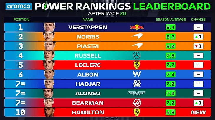 В общем зачете рейтинга лидерство сохраняет Макс Ферстаппен, а Ландо Норрис обошел Оскара Пиастри в споре за вторую позицию.