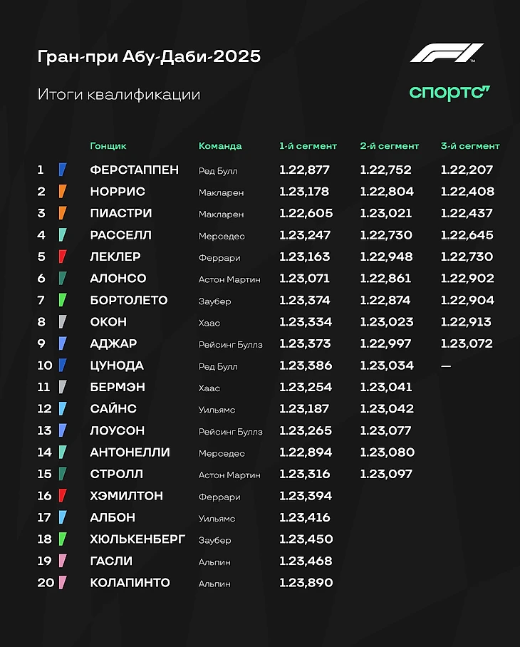 Гран-при Абу-Даби-2025. Ферстаппен выиграл квалификацию к финальной гонке сезона, Норрис – 2-й, Пиастри – 3-й