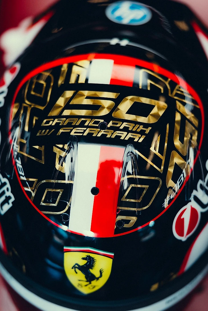 Пилот «Феррари» Шарль Леклер отмечает юбилейную гонку в составе Скудерии особым шлемом.