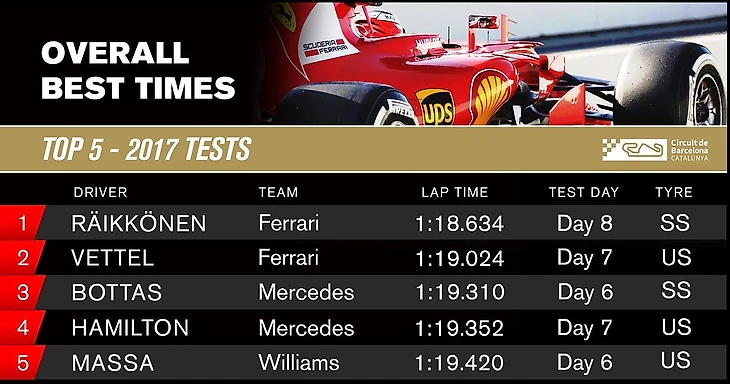 В Барселоне Кими Райкконен не просто демонстрировал стабильно высокие времена на круге, а и установил лучшее время тестов (притом, даже не на самых мягких шинах), проехав круг за 1.18,634, совсем немного до абсолютного. Что еще не маловажно, финн привез своему соотечественнику Валттери Боттасу 0,7 секунды! В отличии от прошлого сезона, когда пилоты Скудерии также были самыми быстрыми на тестах, «Феррари» сделала огромный шаг вперед. Если в прошлом году красные болиды оказались выше Серебряных стрел только из-за целенаправленности «Мерседеса» на работу с длинными отрезками и более жесткими шинами, сейчас – «Феррари» также смотрелся надежно, а те же 0,7 секунды Кими привез на шинах SS, тогда как Валттери был на более мягком комплекте US.
