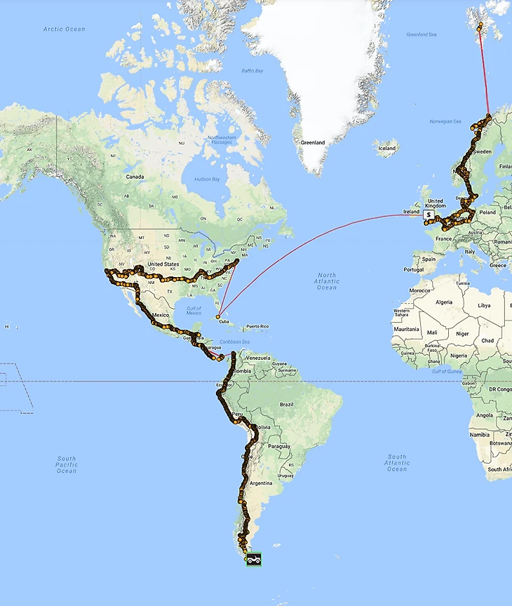 Из самого северного до самого южного бара британец добирался на зеленом TVR Chimaera, который получил от него имя Кермит. Сначала его машину из Саутгемптона переправили в Нью-Йорк, а оттуда он поехал на западное побережье, где уже пересек границу с Мексикой и переехал в Южную Америку.