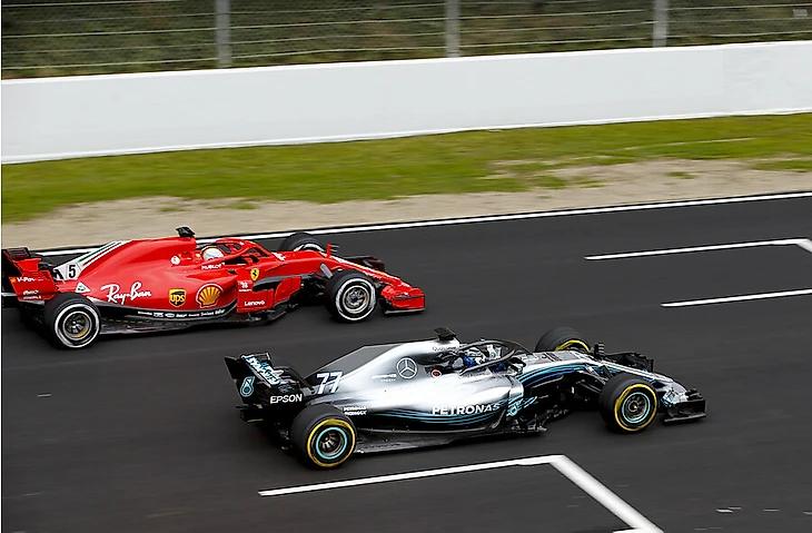 Начнём с Боттаса. Его первый отрезок состоял из 28 кругов, из которых второй он проехал примерно за 1 мин. 23 секунды. По расчётам, в баке его машины в начале отрезка было 97,3 кг топлива – этого достаточно, чтобы проехать 65 кругов по барселонской трассе. Можно вычислить, что с небольшой топливной нагрузкой он бы мог проходить круги за 1 мин. 19,6 секунды.