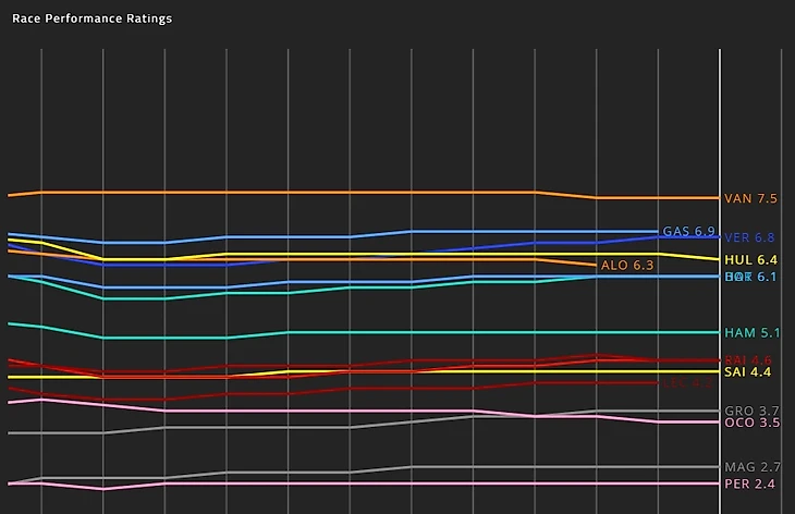 На официальном сайте «Формулы-1» в разделе лайвтайминга на странице «выступлений» появились оценки пилотам за Гран-при Германии, основанные на данных телеметрии. В соответствии с ними лучше всех пилотировал от старта до финиша именно лидер «Макларена» по свиданиям с дочкой босса Стоффель Вандорн.