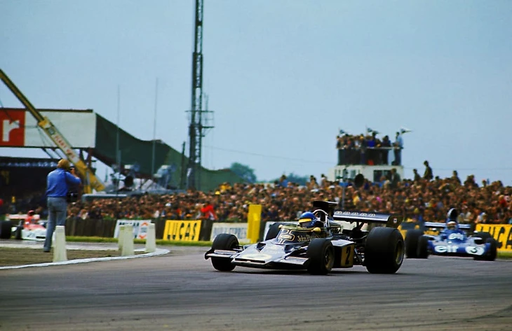 Петерсон впереди Джеки Стюарта в повороте Woodcote в Сильверстоуне в 1973 году.
