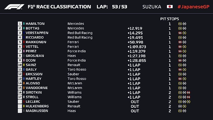 ПП-Хэмильтон(5) Лк-Райкконен Нп-Хюлькенберг 1.Хэмильтон(25) 2. Феттель(10) 3.Боттас(18) 4.Ферстаппен(18) 5.Райкконен(25) 6.Окон(12) 7. Леклер 8.Грожан(25) 9.Магнуссен 10.Перес(12)