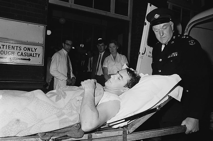 Ðжеки СÑÑаÑÑа пеÑевозÑÑ Ð² гоÑпиÑÐ°Ð»Ñ Ð¿Ð¾Ñле аваÑии в ÐÑан-пÑи ÐелÑгии, 1966 год