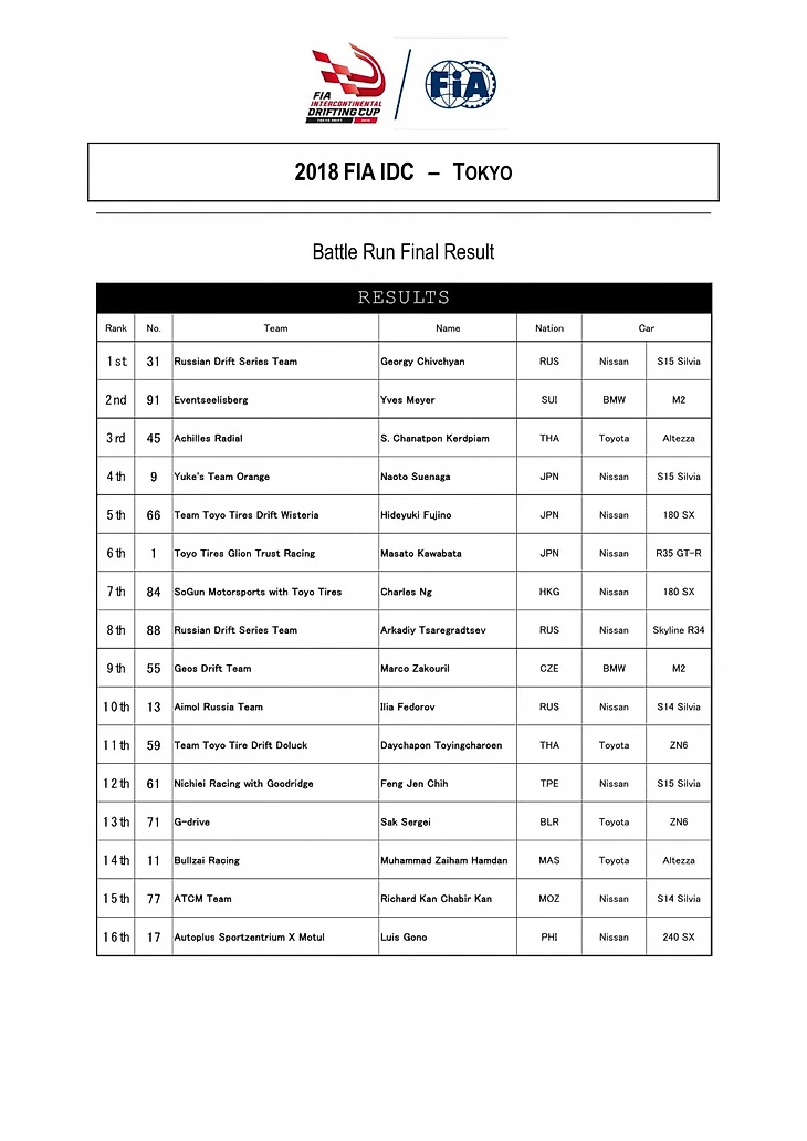 Коротко. Сегодня 4.11.2018, произошло то, что могло произойти ещё в прошлом году. Георгий Чивчан одержал победу на чемпионате FIA Intercontinental Drifting Cup 2018. После уверенной победы в квалификации не осталось сомнений в том, что Гоча один из основных претендентов на титул. Но в ТОП-16 всех нас ждало два неприятных сюрприза. Первый - Аркадий Цареградцев и Илья Фёдоров квалифицировались таким образом, что в топ-16 они попали друг на друга. Второй - пошёл дождь и дорожное покрытие парковки на Одайбе намокло, скорости сильно упали, соответственно зрелищность заездов стремилась к нулю.