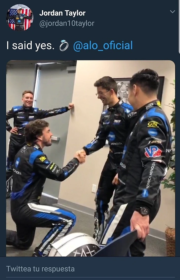 При встрече с напарником и товарищем по команде Джорданом Тэйлором (победитель «Ле-Мана», IMSA и «Дайтоны») испанец внезапно встал на одно колено и сделал предложение.