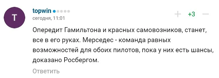 Теперь будет интересно, как на этот результат отреагирует Хэмилтон, поскольку он понимает, что не заинтересован во втором месте – особенно если впереди окажется напарник. Льюис будет надеяться, что успех Валттери окажется разовым, но если в Бахрейне или Китае все повторится, будет крайне интересно наблюдать за динамикой развития ситуации в «Мерседесе». Эта битва только начинается».