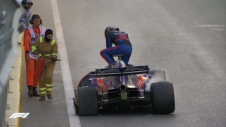 В итоге задняя и передняя подвески на STR14 пошли вразнос, правое переднее колесо отметило столкновение дымом из тормозного диска, а левое переднее колесо загорелось.